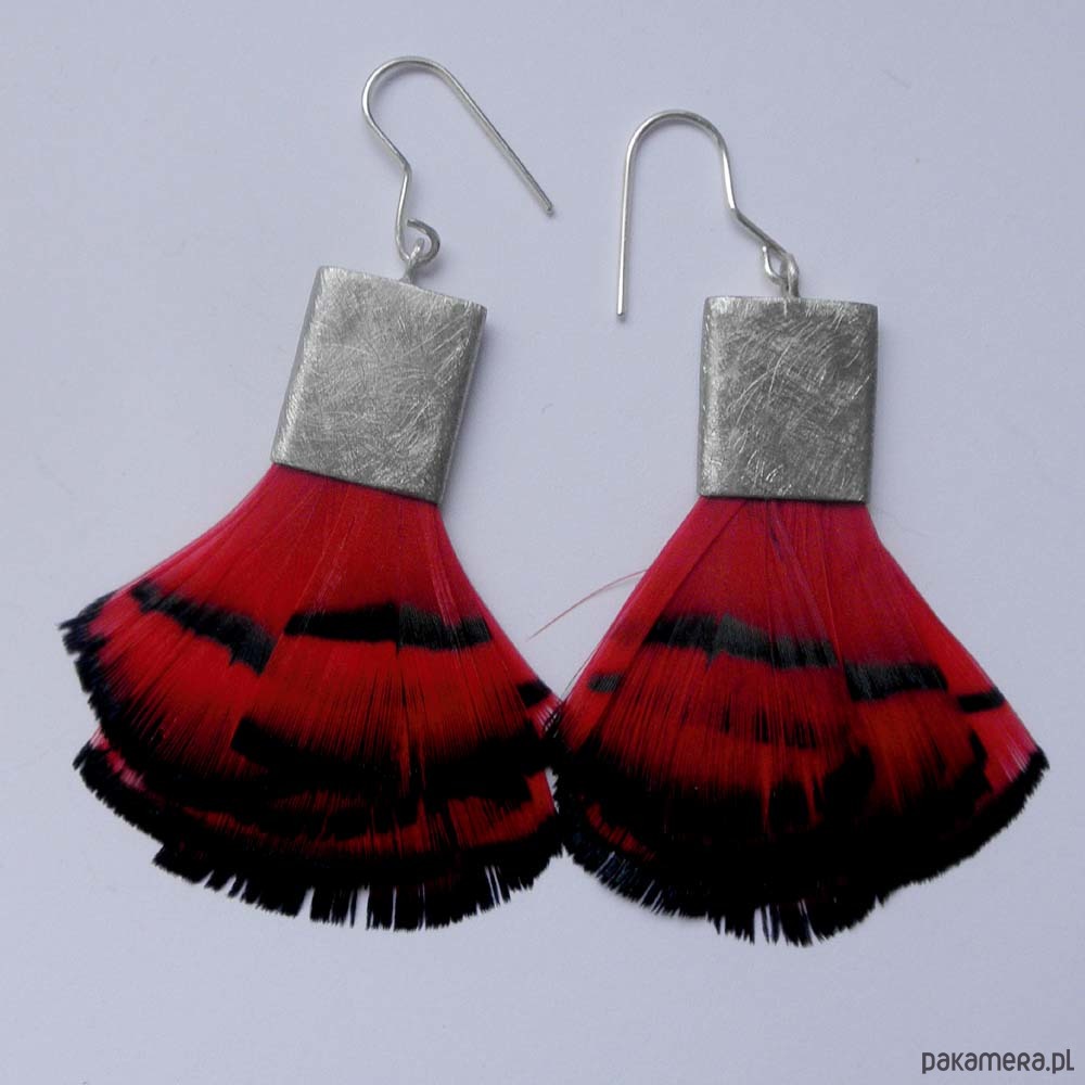 PIÓRKO - stylowy dodatek. Połączenie lekkości piórka i trwałości metalu. Metal niezwykle kontrastuje z naturalnym barwionym puchem. Kolczyki wykonane są z alpaki, naturalnie barwione pióra. Alpaka - zmatowiona. Bigle otwarte - srebro pr.925. Długość z biglami -7,5 cm. Szerokość - 3,5 cm.