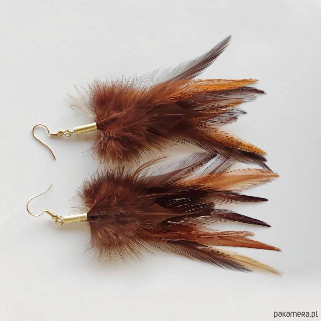 PIÓRKO - stylowy dodatek. Połączenie lekkości piórka i trwałości metalu. Metal niezwykle kontrastuje z naturalnym barwionym puchem. Kolczyki wykonane są z : mosiądz srebro, naturalne barwione pióra. Bigle otwarte - srebro pr.925 pozłacane . Długość z biglami -10 cm.
