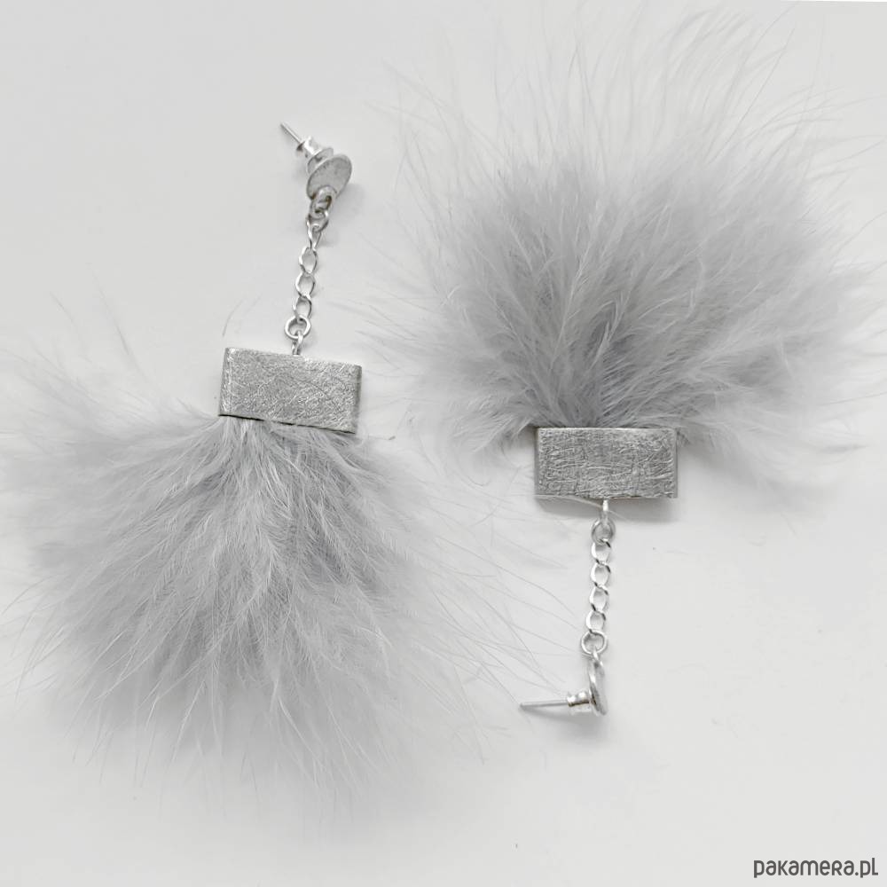 PIÓRKO - stylowy dodatek. Połączenie lekkości piórka i trwałości metalu. Metal niezwykle kontrastuje z naturalnym barwionym puchem. Kolczyki na sztyftach wykonane są z alpaki, srebro ( pr.925), naturalnie barwione pióra. Alpaka - zmatowiona. Długość z ok.9 cm. Szerokość - 5,5 cm.