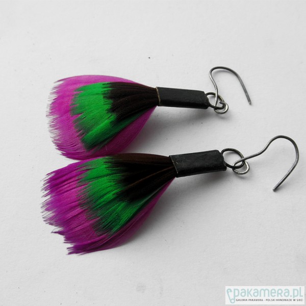 PIÓRKO - stylowy dodatek. Połączenie lekkości piórka i trwałości metalu. Metal niezwykle kontrastuje z naturalnym barwionym puchem. Kolczyki wykonane są z mosiądzu, naturalnie barwione pióra. Mosiądz - oksydowany. Bigle otwarte - srebro pr.925,oksydowane. Długość z biglami - 7,5 cm. Szerokość - 3 cm.