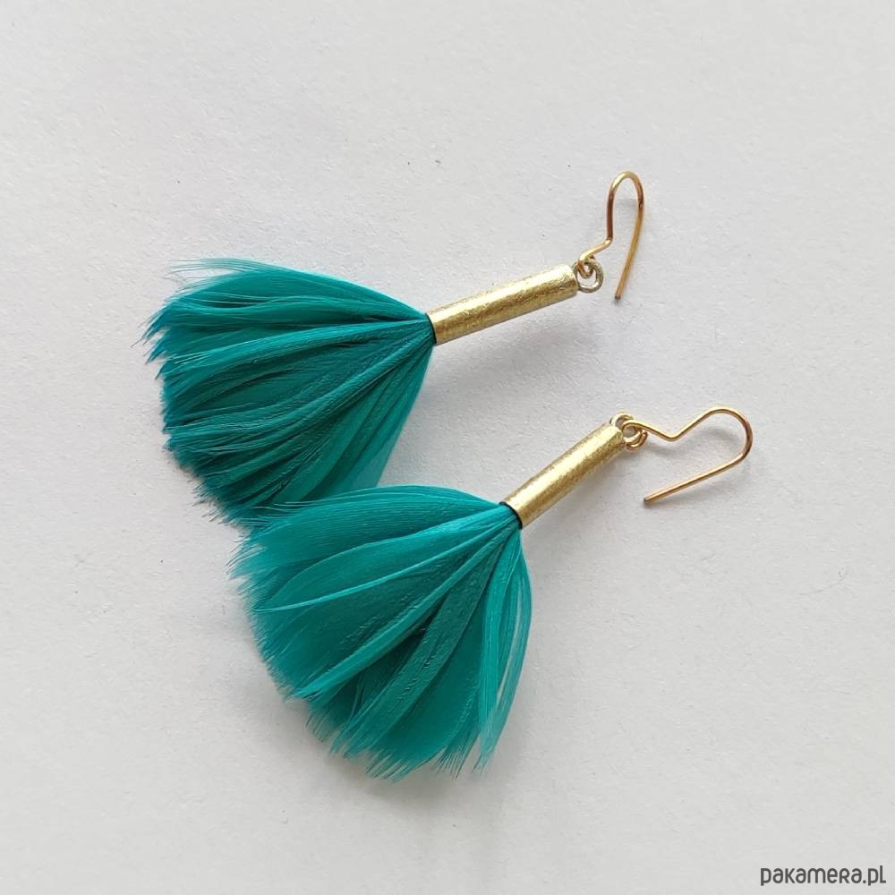 PIÓRKO - stylowy dodatek. Połączenie lekkości piórka i trwałości metalu. Metal niezwykle kontrastuje z naturalnym barwionym puchem. Kolczyki wykonane są z mosiądzu, naturalnie barwione pióra. Mosiądz - zmatowiony. Bigle otwarte - srebro pr.925 pozłacane. Długość z biglami - ok. 5,5 cm. Szerokość - 2 cm. Waga - ok. 2,3 g.