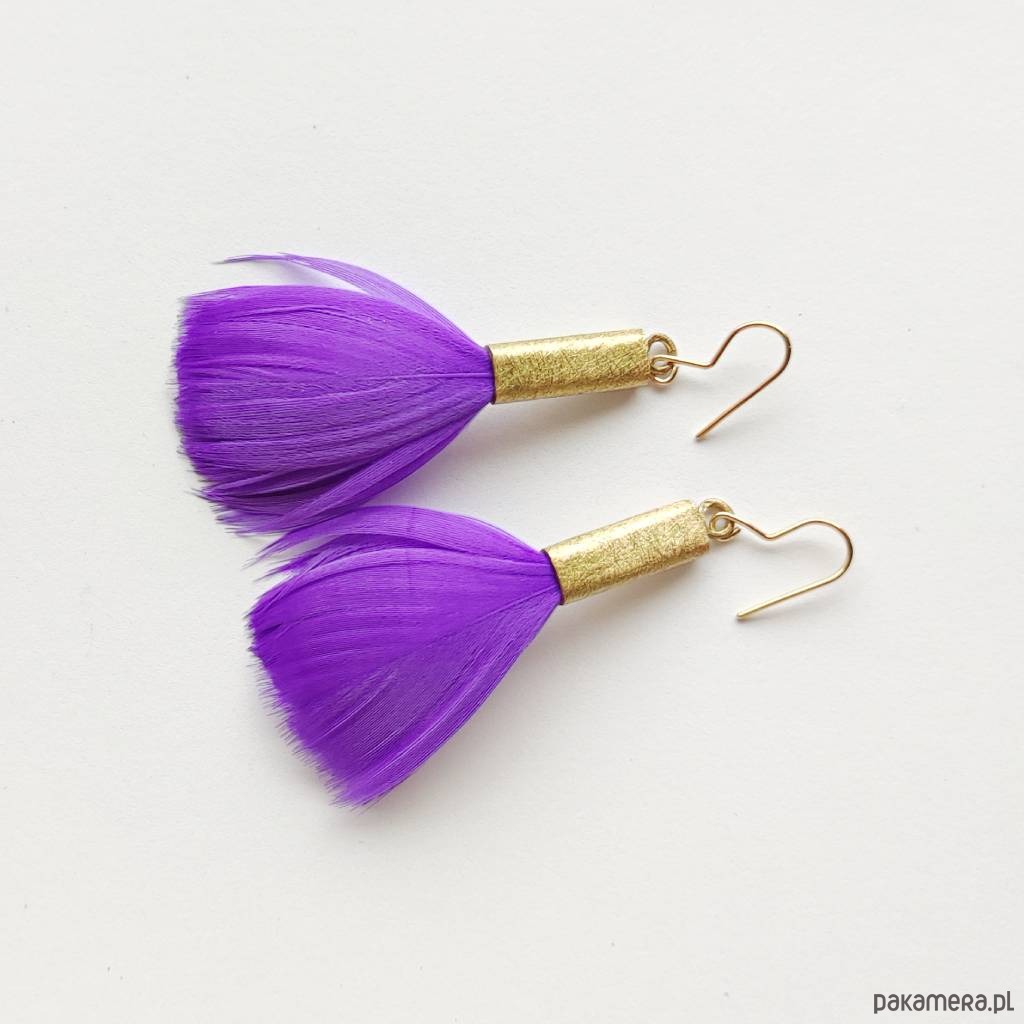 PIÓRKO - stylowy dodatek. Kolczyki przykuwają uwagę. Połączenie lekkości piórka i trwałości metalu. Metal niezwykle kontrastuje z naturalnym barwionym puchem. Kolczyki wykonane są z mosiądz, naturalnie barwione pióra. Mosiądz jest zmatowiony. Bigle otwarte - srebro pr.925 pozłacane. Długość kolczyków z biglami - 7,5 cm. Szerokość - 3 cm. Waga - ok. 2,5 g. Istniej możliwość wykonania kolczyków w innej kolorystyce.
