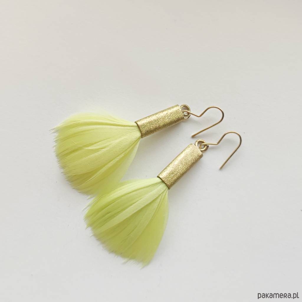 PIÓRKO - stylowy dodatek. Kolczyki przykuwają uwagę. Połączenie lekkości piórka i trwałości metalu. Metal niezwykle kontrastuje z naturalnym barwionym puchem. Kolczyki wykonane są z mosiądz, naturalnie barwione pióra. Mosiądz jest zmatowiony. Bigle otwarte - srebro pr.925 pozłacane. Długość kolczyków z biglami - 7,5 cm. Szerokość - 3 cm. Waga - ok. 2,5 g. Istniej możliwość wykonania kolczyków w innej kolorystyce.