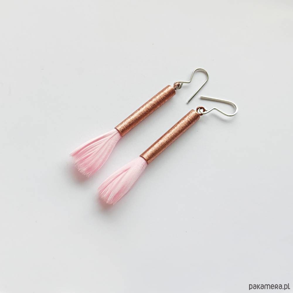 PIÓRKO - stylowy dodatek. Połączenie lekkości piórka i trwałości metalu. Metal niezwykle kontrastuje z naturalnym barwionym puchem. Kolczyki wykonane są z miedzi, naturalnie barwione pióra. Miedź - zmatowiony. Bigle otwarte - srebro pr.925. Długość z biglami - 5 cm.