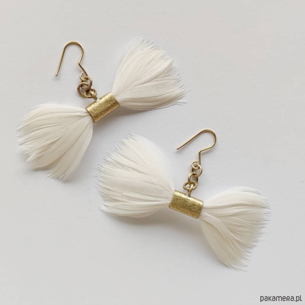 PIÓRKO - stylowy dodatek. Połączenie lekkości piórka i trwałości metalu. Metal niezwykle kontrastuje z naturalnym barwionym puchem. Kolczyki wykonane są z mosiądz, naturalnie barwione pióra. Mosiądz - zmatowiony. Bigle otwarte - srebro pr.925 pozłacane. Długość z biglami - 4,5 cm, szerokość - 5,5 cm