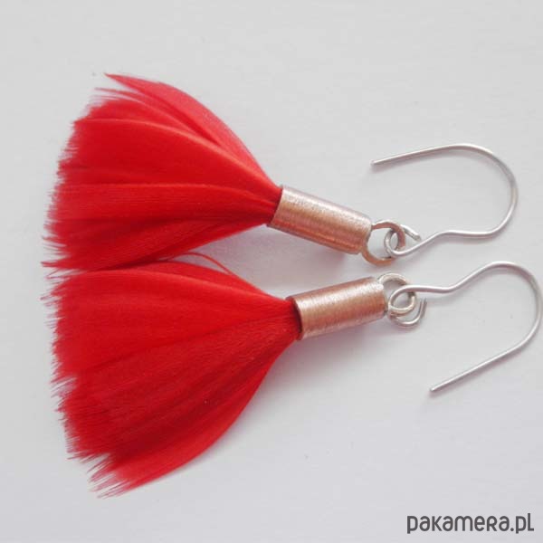 PIÓRKO - stylowy dodatek. Połączenie lekkości piórka i trwałości metalu. Metal niezwykle kontrastuje z naturalnym barwionym puchem. Kolczyki wykonane są z : miedź, naturalne barwione pióra. Miedź : zmatowiona. Bigle otwarte - srebro pr.925. Długość z biglami -6,5 cm.