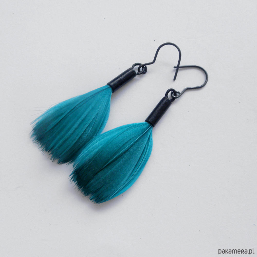 PIÓRKO - stylowy dodatek. Połączenie lekkości piórka i trwałości metalu. Metal niezwykle kontrastuje z naturalnym barwionym puchem. Kolczyki wykonane są z mosiądzu, naturalnie barwione pióra. Mosiądz - oksydowan. Bigle otwarte - srebro pr.925,oksydowane. Długość z biglami - ok. 5,5 cm. Szerokość - 2 cm. Waga - ok. 2,3 g.