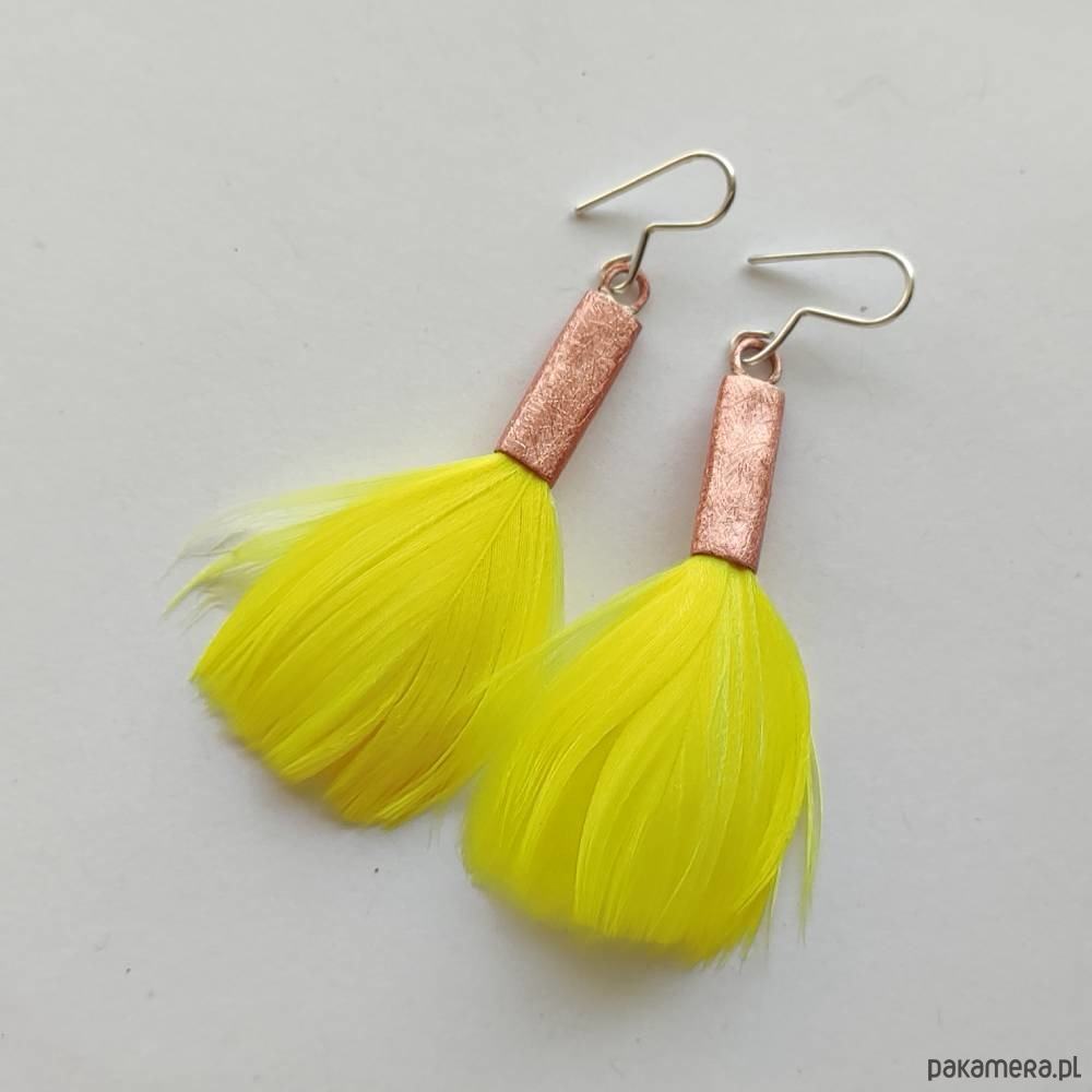 PIÓRKO - stylowy dodatek. Połączenie lekkości piórka i trwałości metalu. Metal niezwykle kontrastuje z naturalnym barwionym puchem. Kolczyki wykonane są z miedzi, naturalnie barwione pióra. Miedź - zmatowiony. Bigle otwarte - srebro pr.925. Długość z biglami - 7,5 cm. Szerokość - 3 cm. Waga - ok. 2,5 g.