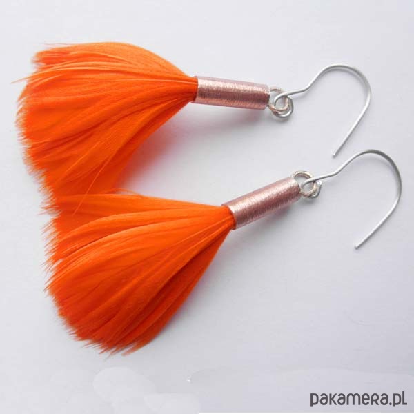 PIÓRKO - stylowy dodatek. Połączenie lekkości piórka i trwałości metalu. Metal niezwykle kontrastuje z naturalnym barwionym puchem. Kolczyki wykonane są z : miedź, naturalne barwione pióra. Miedź : zmatowiona. Bigle otwarte - srebro pr.925. Długość z biglami - 8 cm. Waga: ok. 3 g
