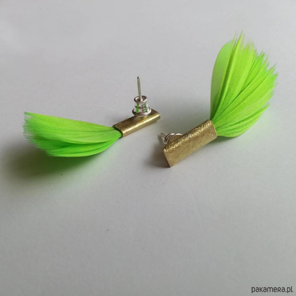 PIÓRKO - stylowy dodatek. Połączenie lekkości piórka i trwałości metalu. Metal niezwykle kontrastuje z naturalnym barwionym puchem.Kolczyki na sztyftach. Kolczyki wykonane są z :mosiądz,srebro- próby 0,925, naturalnie barwione pióra. Mosiądz - zmatowiony. Długość - ok. 3,5cm. Szerokość - 2 cm. Waga - ok. 2 g.