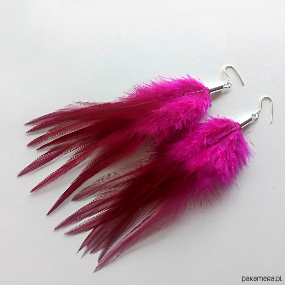 PIÓRKO - stylowy dodatek. Połączenie lekkości piórka i trwałości metalu. Metal niezwykle kontrastuje z naturalnym barwionym puchem. Kolczyki wykonane są z : srebro, naturalne barwione pióra. Bigle otwarte - srebro pr.925. Długość z biglami -14 cm.