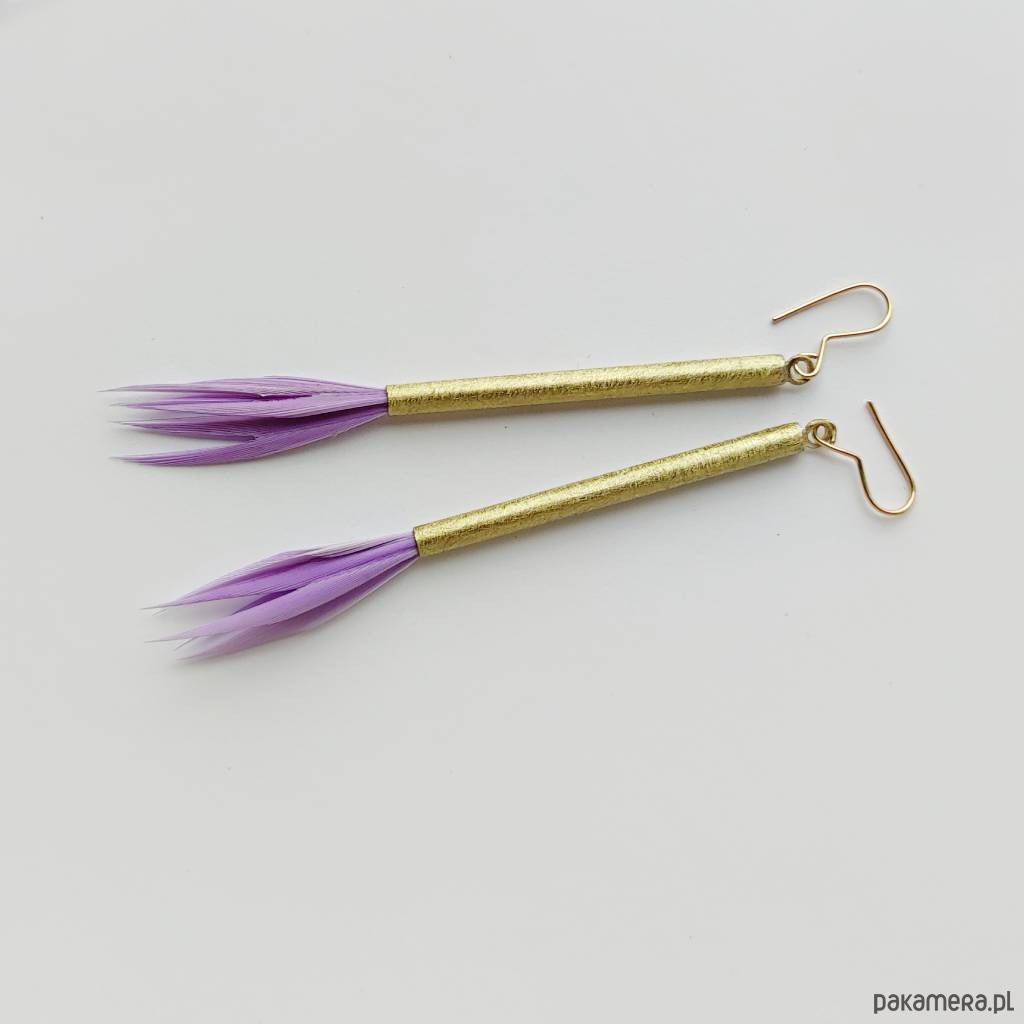 PIÓRKO - stylowy dodatek. Połączenie lekkości piórka i trwałości metalu. Metal niezwykle kontrastuje z naturalnym barwionym puchem. Kolczyki wykonane są z : mosiądz, naturalne barwione pióra. Mosiądz : zmatowiony. Bigle otwarte - srebro pr.925. Długość z biglami - 9 cm.