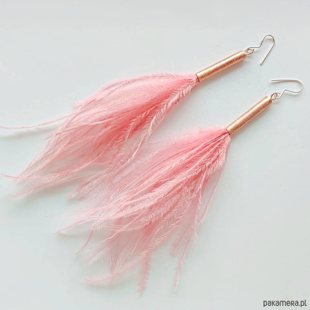 PIÓRKO - stylowy dodatek. Połączenie lekkości piórka i trwałości metalu. Metal niezwykle kontrastuje z naturalnym barwionym puchem. Kolczyki wykonane są z miedzi, naturalnie barwione pióra. Miedź - zmatowiony. Bigle otwarte - srebro pr.925. Długość z biglami - 15 cm.
