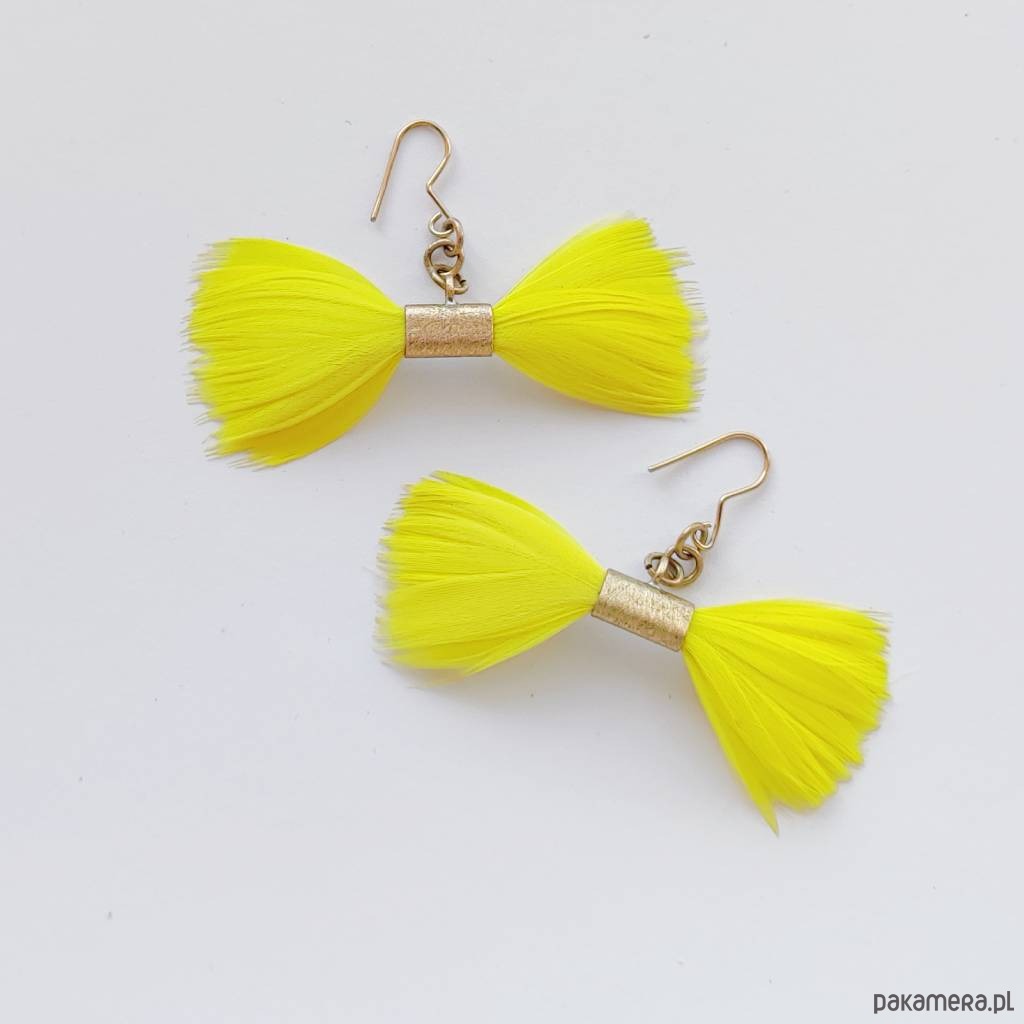 PIÓRKO - stylowy dodatek. Połączenie lekkości piórka i trwałości metalu. Metal niezwykle kontrastuje z naturalnym barwionym puchem. Kolczyki wykonane są z mosiądz, naturalnie barwione pióra. Mosiądz - zmatowiony. Bigle otwarte - srebro pr.925 pozłacane. Długość z biglami - 4,5 cm, szerokość - 5,5 cm