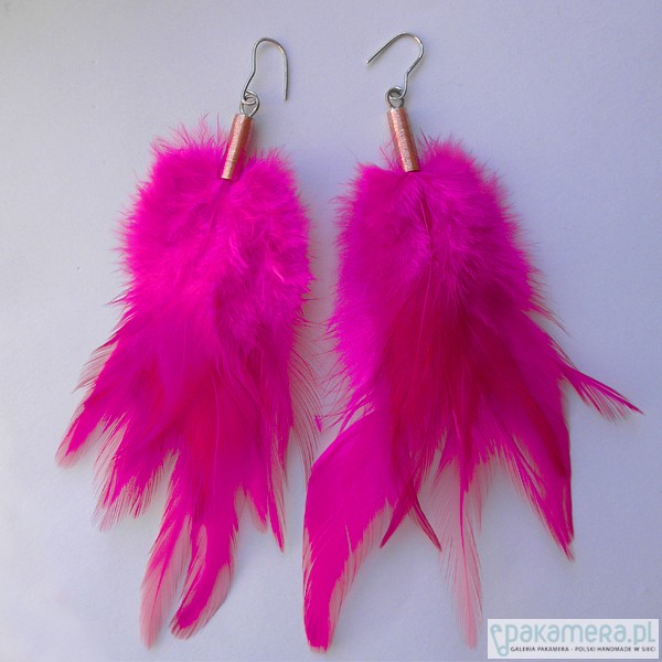 PIÓRKO - stylowy dodatek. Połączenie lekkości piórka i trwałości metalu. Metal niezwykle kontrastuje z naturalnym barwionym puchem. Kolczyki wykonane są z : miedź, naturalne barwione pióra. Miedź : zmatowiona. Bigle otwarte - srebro pr.925. Długość z biglami - 11 cm.