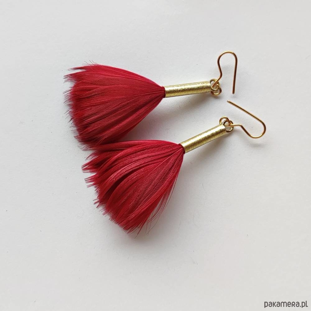 PIÓRKO - stylowy dodatek. Połączenie lekkości piórka i trwałości metalu. Metal niezwykle kontrastuje z naturalnym barwionym puchem. Kolczyki wykonane są z mosiądzu, naturalnie barwione pióra. Mosiądz - zmatowiony. Bigle otwarte - srebro pr.925, pozłacane, Długość z biglami - ok. 5,5 cm. Szerokość - 2 cm. Waga - ok. 2,3 g.