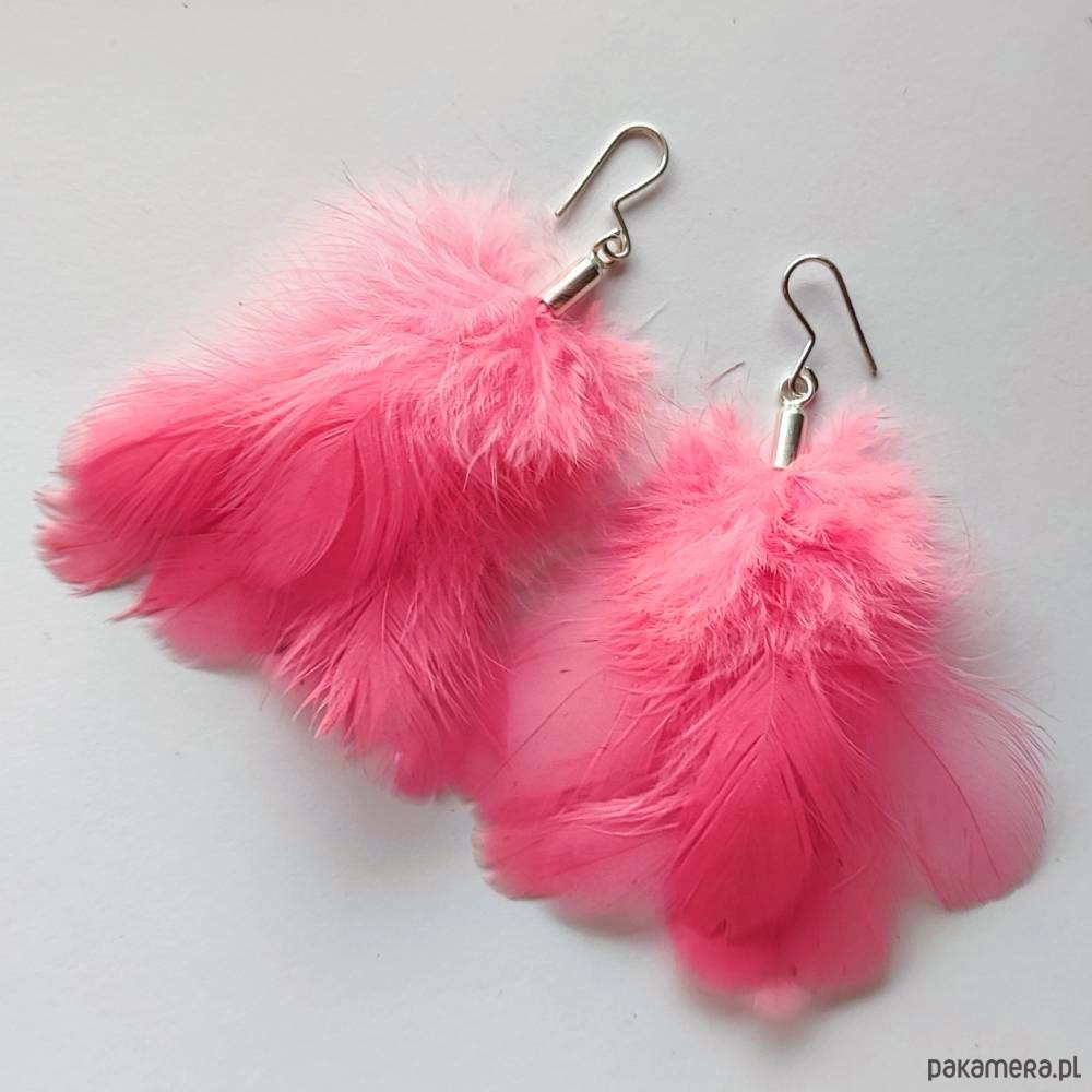 PIÓRKO - stylowy dodatek. Połączenie lekkości piórka i trwałości metalu. Metal niezwykle kontrastuje z naturalnym barwionym puchem. Kolczyki wykonane są z srebro, naturalnie barwione pióra. Srebro - wypolerowane. Bigle otwarte - srebro pr.925. Długość z biglami - 8 cm.