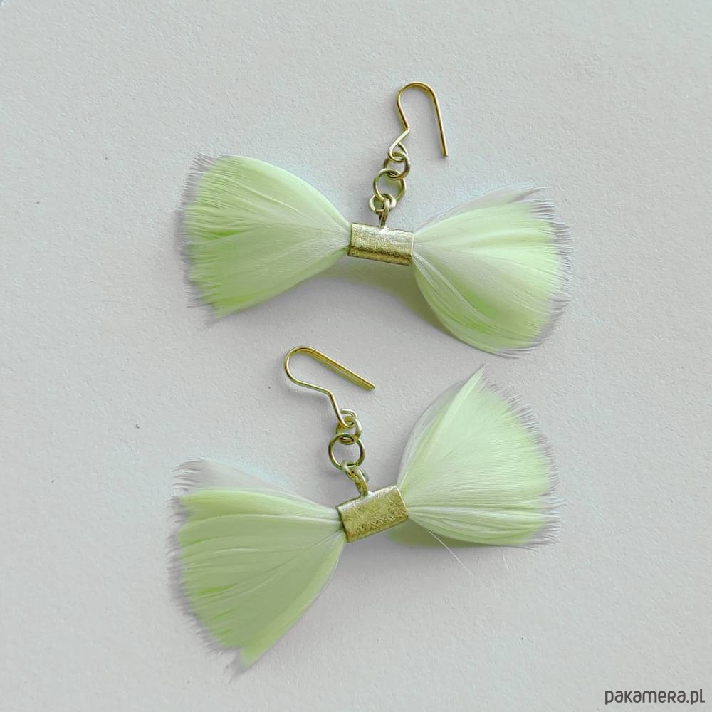 PIÓRKO - stylowy dodatek. Połączenie lekkości piórka i trwałości metalu. Metal niezwykle kontrastuje z naturalnym barwionym puchem. Kolczyki wykonane są z mosiądz, naturalnie barwione pióra. Mosiądz - zmatowiony. Bigle otwarte - srebro pr.925 pozłacane. Długość z biglami - 4,5 cm, szerokość - 5,5 cm