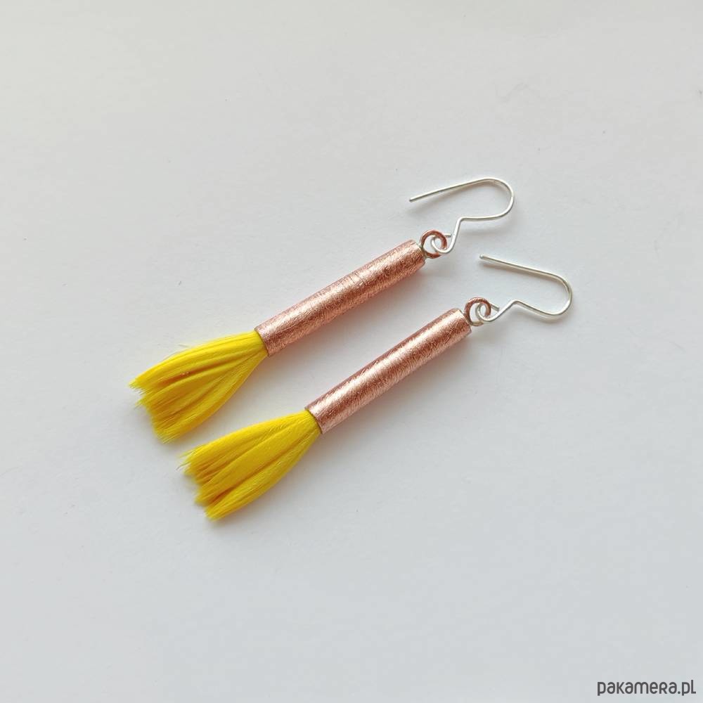 PIÓRKO - stylowy dodatek. Połączenie lekkości piórka i trwałości metalu. Metal niezwykle kontrastuje z naturalnym barwionym puchem. Kolczyki wykonane są z miedzi, naturalnie barwione pióra. Miedź - zmatowiony. Bigle otwarte - srebro pr.925. Długość z biglami - 5 cm.