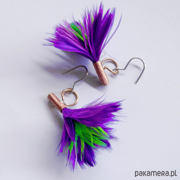 PIÓRKO - stylowy dodatek. Połączenie lekkości piórka i trwałości metalu. Metal niezwykle kontrastuje z naturalnym barwionym puchem. Kolczyki wykonane są z miedź, naturalnie barwione pióra. Miedź - zmatowiony. Bigle otwarte - srebro pr.925. Długość z biglami ok. 3 cm. Szerokość - ok. 3cm.