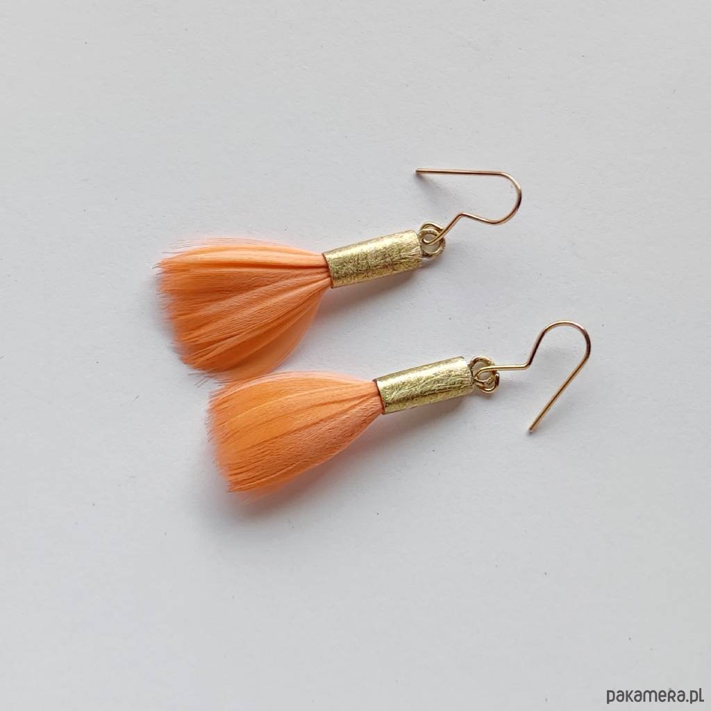 PIÓRKO - stylowy dodatek. Delikatne oraz lekkie kolczyki dodadzą charakteru każdej stylizacji. Metal niezwykle kontrastuje z naturalnym barwionym puchem. Kolczyki wykonane są z miedzi, naturalnie barwione pióra. Miedź - zmatowiony. Bigle otwarte - srebro pr.925. Długość z biglami - 4,5 cm. Szerokość - 1,5 cm. Waga - ok. 2,5 g.