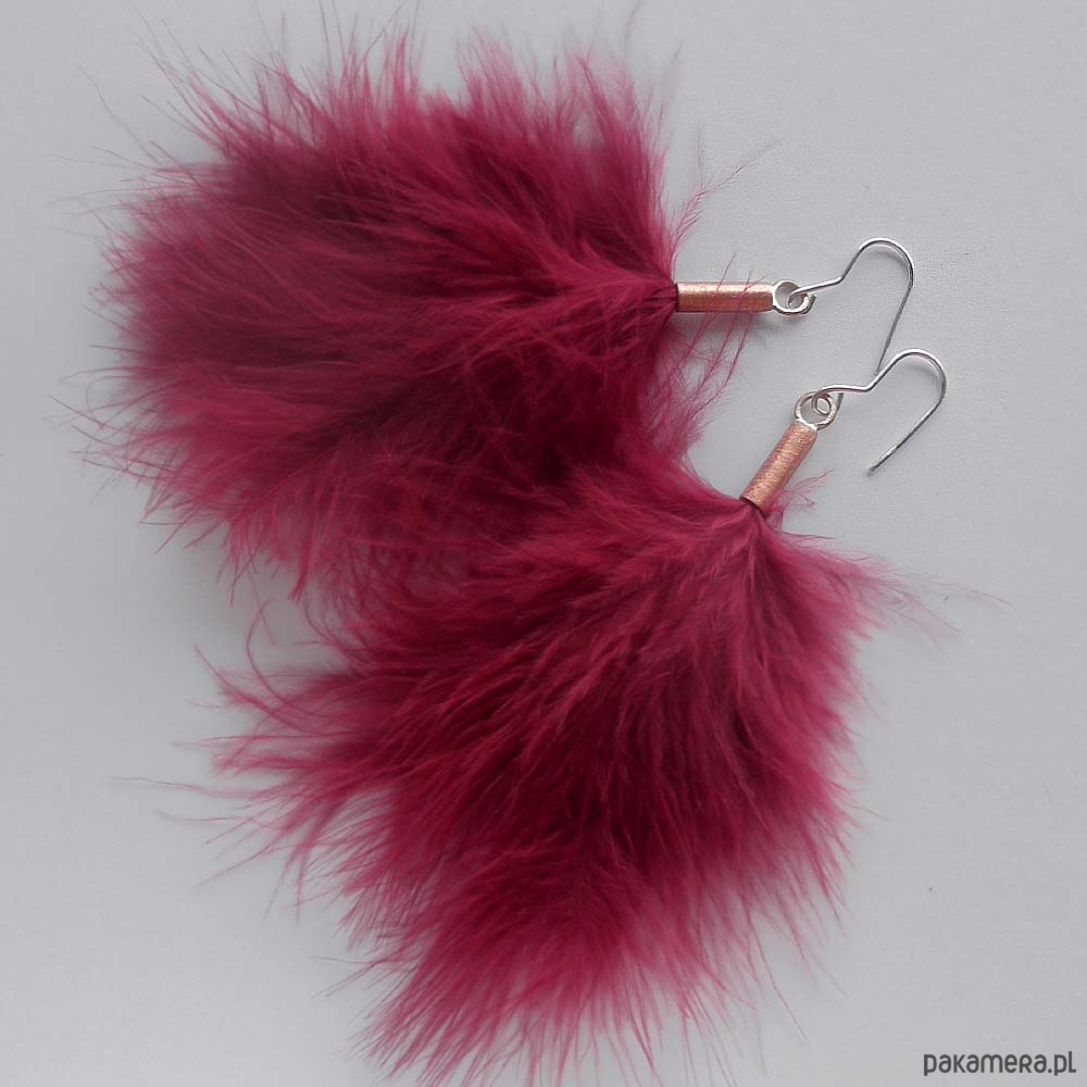 PIÓRKO - stylowy dodatek. Połączenie lekkości piórka i trwałości metalu. Metal niezwykle kontrastuje z naturalnym barwionym puchem. Kolczyki wykonane są z : miedź, naturalne barwione pióra. Miedź - zmatowiona. Bigle otwarte - srebro pr. 925. Długość z biglami - 9 cm.