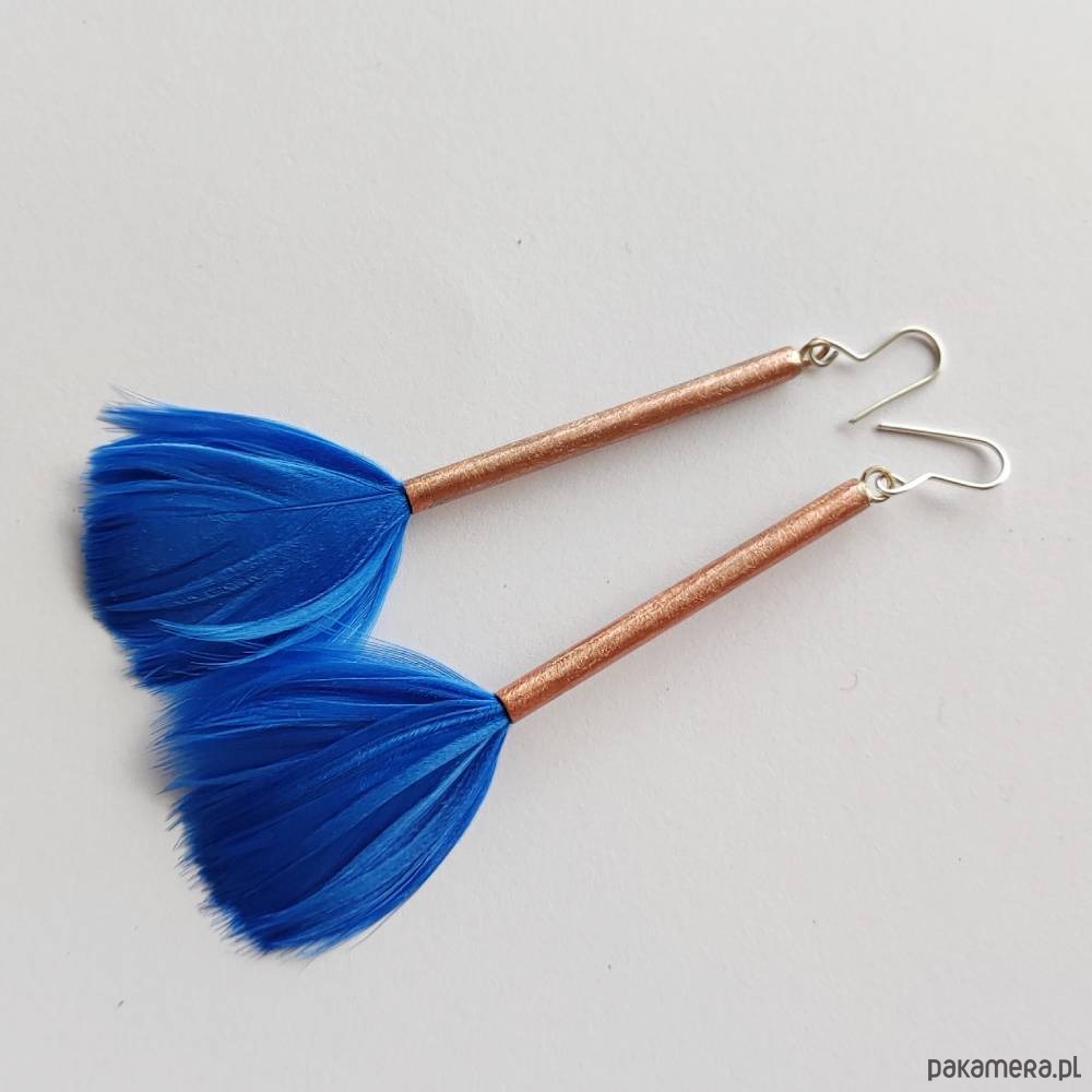 PIÓRKO - stylowy dodatek. Połączenie lekkości piórka i trwałości metalu. Metal niezwykle kontrastuje z naturalnym barwionym puchem. Kolczyki wykonane są z : miedź, naturalne barwione pióra. Miedź : zmatowiona. Bigle otwarte - srebro pr.925. Długość z biglami - 9 cm.