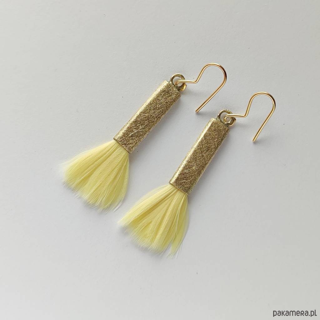 PIÓRKO - stylowy dodatek. Połączenie lekkości piórka i trwałości metalu. Metal niezwykle kontrastuje z naturalnym barwionym puchem. Kolczyki wykonane są z miedzi, naturalnie barwione pióra. Miedź - zmatowiony. Bigle otwarte - srebro pr.925. Długość z biglami - 5,5 cm. Szerokość - 1,5 cm. Waga - ok. 2,5 g.