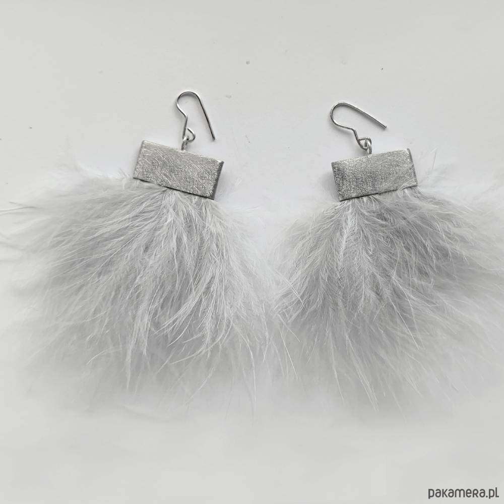 PIÓRKO - stylowy dodatek. Połączenie lekkości piórka i trwałości metalu. Metal niezwykle kontrastuje z naturalnym barwionym puchem. Kolczyki wykonane są z alpaka, naturalnie barwione pióra.Alpaka - zmatowiona. Bigle otwarte - srebro pr.925. Długość z biglami - 8 cm. Szerokość - 8 cm.
