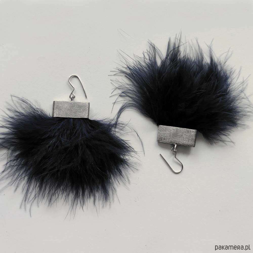 PIÓRKO - stylowy dodatek. Połączenie lekkości piórka i trwałości metalu. Metal niezwykle kontrastuje z naturalnym barwionym puchem. Kolczyki wykonane są z alpaka, naturalnie barwione pióra.Alpaka - zmatowiona. Bigle otwarte - srebro pr.925. Długość z biglami - 8 cm. Szerokość - 8 cm.