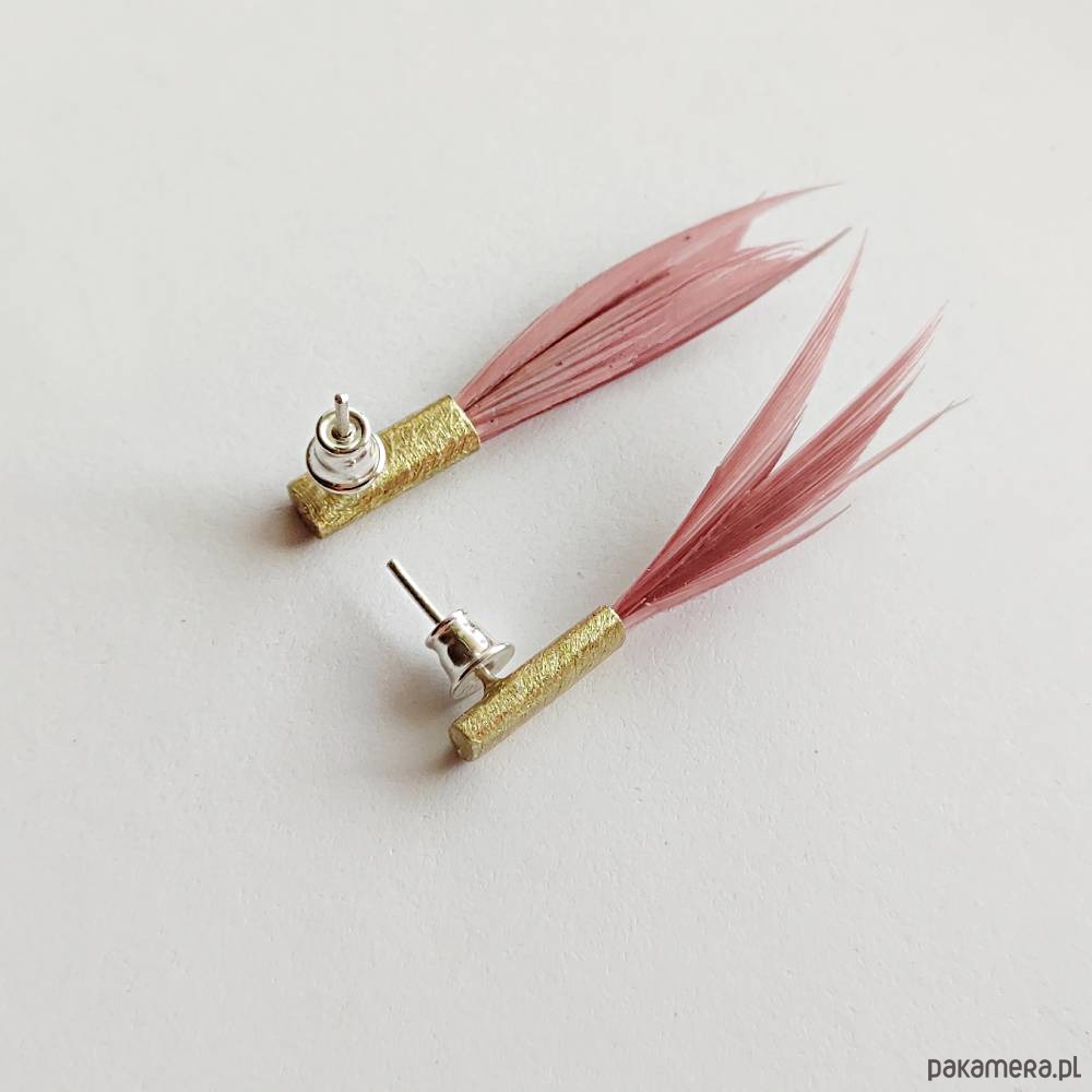 PIÓRKO - stylowy dodatek. Połączenie lekkości piórka i trwałości metalu. Metal niezwykle kontrastuje z naturalnym barwionym puchem.Kolczyki na sztyftach. Kolczyki wykonane są z :mosiądz,srebro- próby 0,925, naturalnie barwione pióra. Mosiądz - zmatowiony. Długość - ok. 4,5cm. Szerokość - 2 cm. Waga - ok. 2 g.
