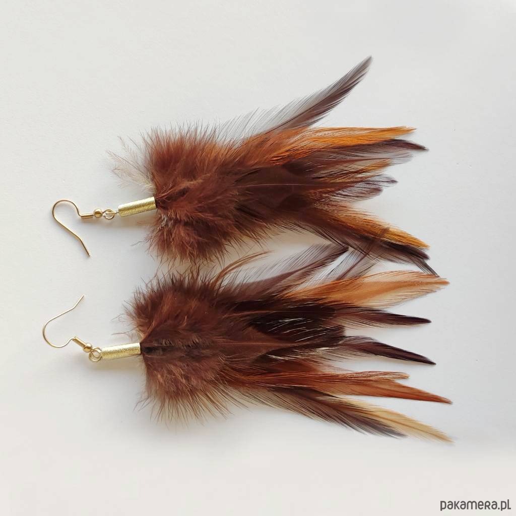 PIÓRKO – stylowy dodatek. Kolczyki są lekkie, zwracają uwagę Idealne dla kobiet, które uwielbiają bawić się modą . Połączenie lekkości piórka i trwałości metalu. Metal niezwykle kontrastuje z naturalnym barwionym puchem. Kolczyki wykonane są z mosiądzu, naturalnie barwione pióra. Mosiądz – zmatowiony. Bigle otwarte – srebro pr.925. Długość z biglami – ok. 11 cm.