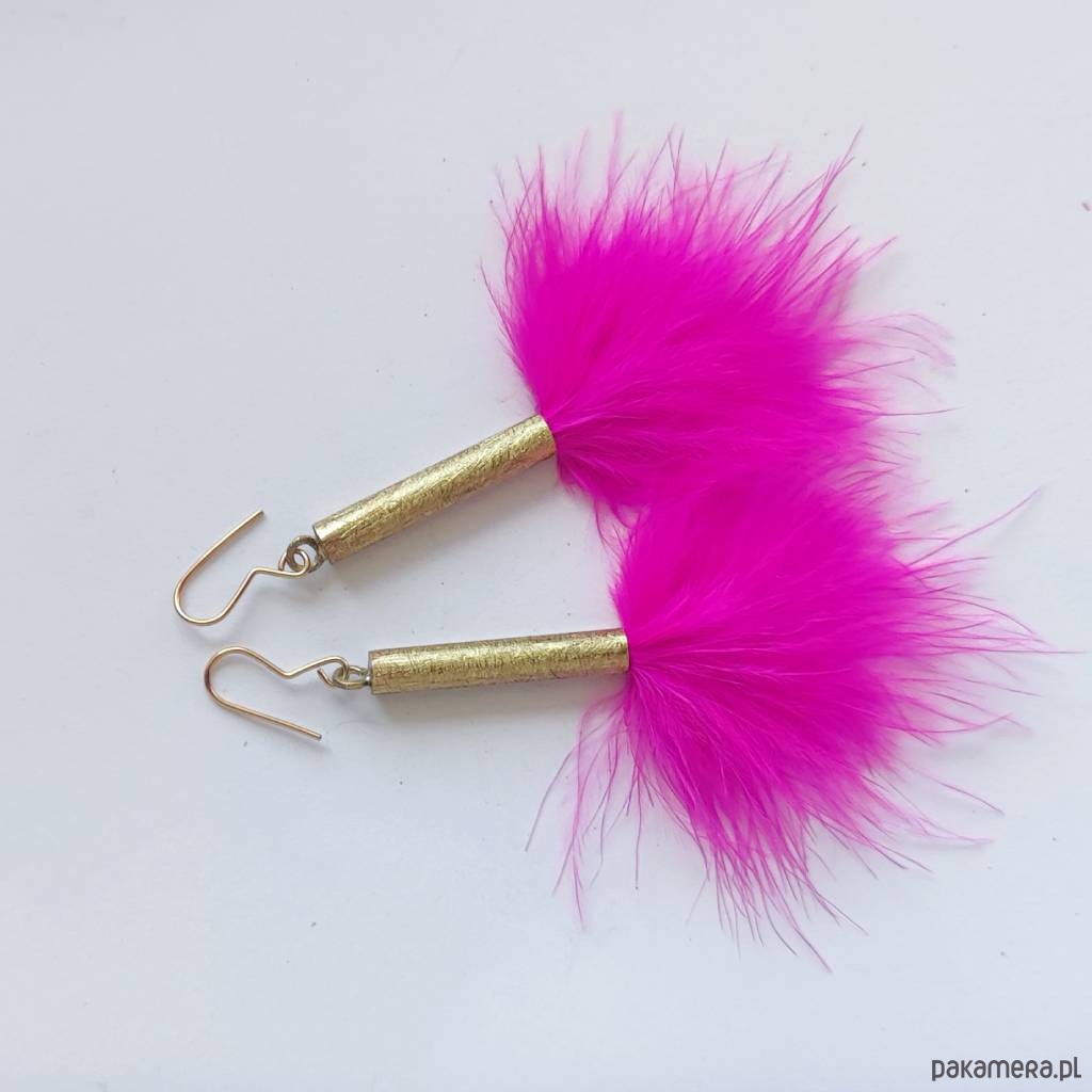 PIÓRKO - stylowy dodatek. Połączenie lekkości piórka i trwałości metalu. Metal niezwykle kontrastuje z naturalnym barwionym puchem. Kolczyki wykonane są z miedzi, naturalnie barwione pióra. Miedź - zmatowiony. Bigle otwarte - srebro pr.925. Długość z biglami - 7,5 cm.