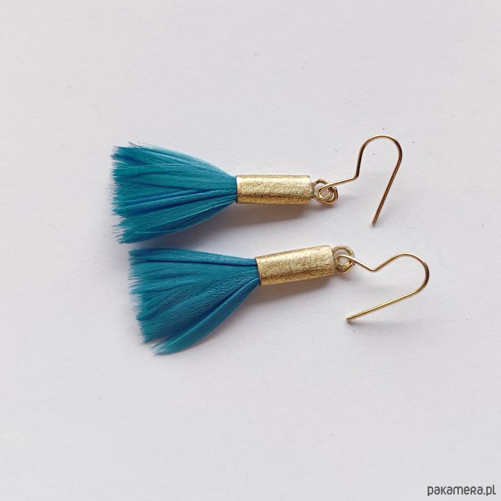 PIÓRKO - stylowy dodatek. Delikatne oraz lekkie kolczyki dodadzą charakteru każdej stylizacji. Metal niezwykle kontrastuje z naturalnym barwionym puchem. Kolczyki wykonane są z miedzi, naturalnie barwione pióra. Miedź - zmatowiony. Bigle otwarte - srebro pr.925. Długość z biglami - 4,5 cm. Szerokość - 1,5 cm. Waga - ok. 2,5 g.