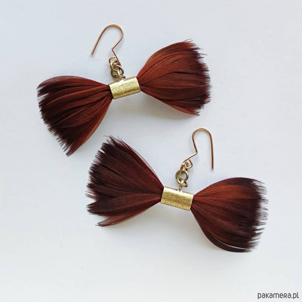 PIÓRKO - stylowy dodatek. Połączenie lekkości piórka i trwałości metalu. Metal niezwykle kontrastuje z naturalnym barwionym puchem. Kolczyki wykonane są z mosiądz, naturalnie barwione pióra. Mosiądz - zmatowiony. Bigle otwarte - srebro pr.925 pozłacane. Długość z biglami - 4,5 cm, szerokość - 5,5 cm