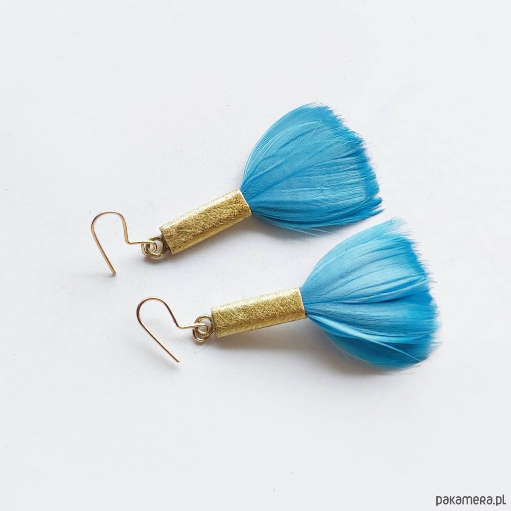 PIÓRKO - stylowy dodatek. Połączenie lekkości piórka i trwałości metalu. Metal niezwykle kontrastuje z naturalnym barwionym puchem. Kolczyki wykonane są z mosiądz, naturalnie barwione pióra. Mosiądz - zmatowiony. Bigle otwarte - srebro pr.925 pozłacane. Długość z biglami - 7,5 cm. Szerokość - 3 cm. Waga - ok. 2,5 g.