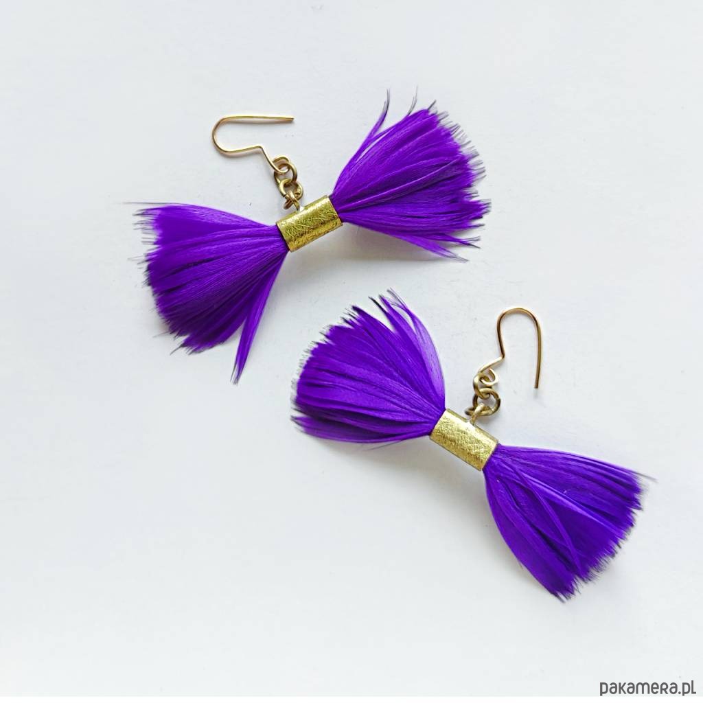 PIÓRKO - stylowy dodatek. Połączenie lekkości piórka i trwałości metalu. Metal niezwykle kontrastuje z naturalnym barwionym puchem. Kolczyki wykonane są z mosiądz, naturalnie barwione pióra. Mosiądz - zmatowiony. Bigle otwarte - srebro pr.925 pozłacane. Długość z biglami - 4,5 cm, szerokość - 5,5 cm