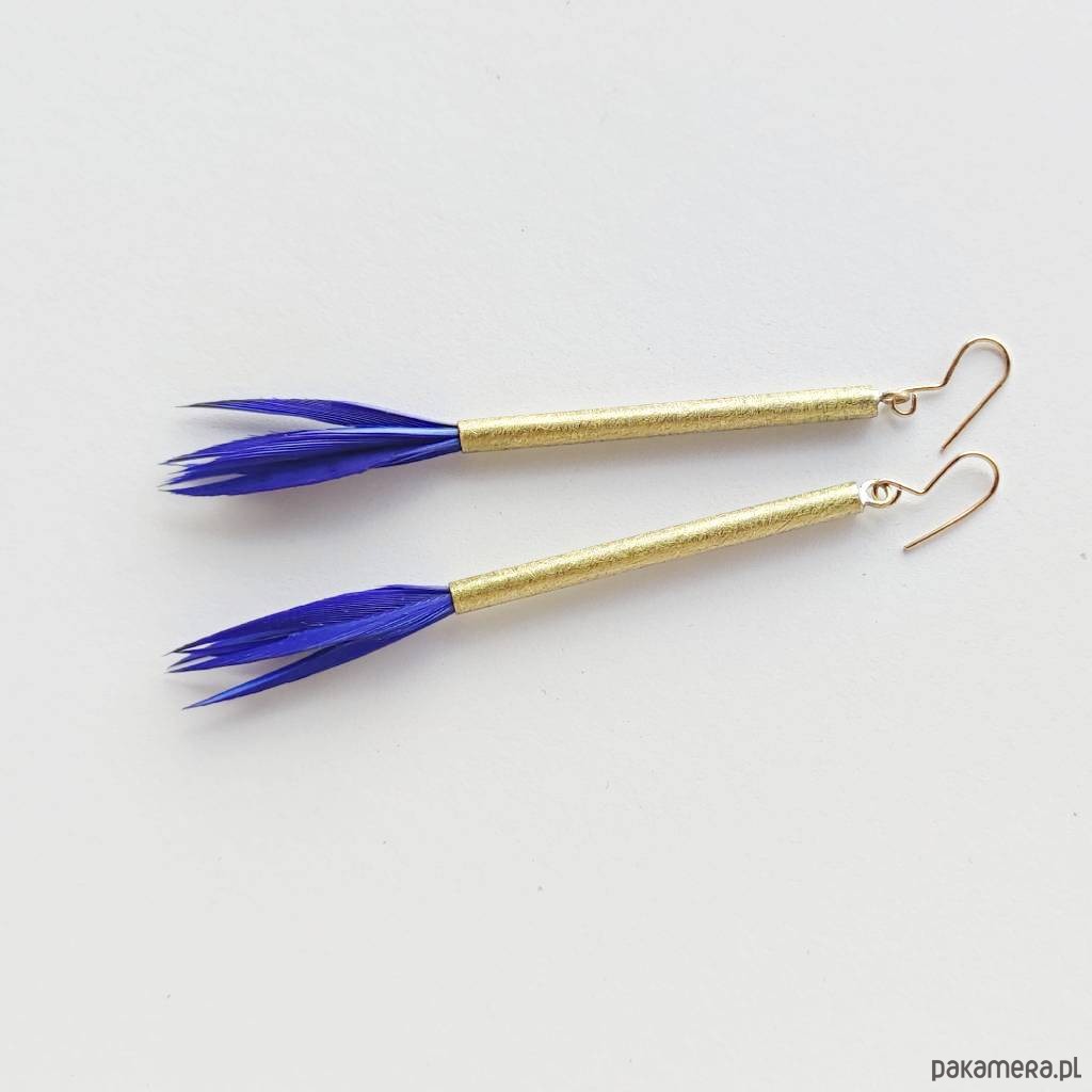 PIÓRKO - stylowy dodatek. Połączenie lekkości piórka i trwałości metalu. Metal niezwykle kontrastuje z naturalnym barwionym puchem. Kolczyki wykonane są z : mosiądz, naturalne barwione pióra. Mosiądz : zmatowiony. Bigle otwarte - srebro pr.925. Długość z biglami - 9 cm. Bardzo oryginalne kolczyki.