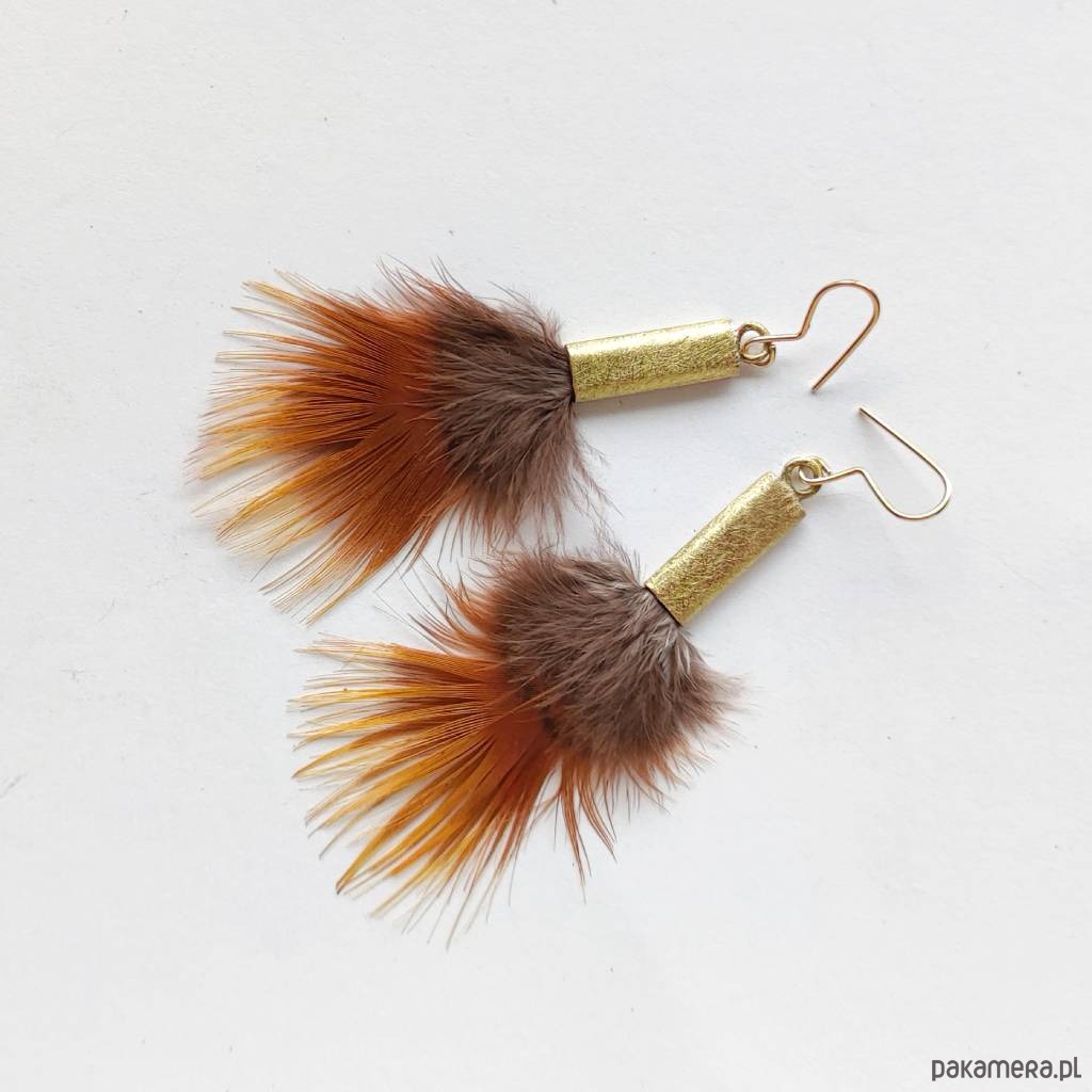 PIÓRKO - stylowy dodatek. Połączenie lekkości piórka i trwałości metalu. Metal niezwykle kontrastuje z naturalnym barwionym puchem. Kolczyki wykonane są z : mosiądz, naturalne barwione pióra. Mosiądz : zmatowiona. Bigle otwarte - srebro pr.925 pozłacane. Długość z biglami - 7 cm. Szerokość ok. 3cm.