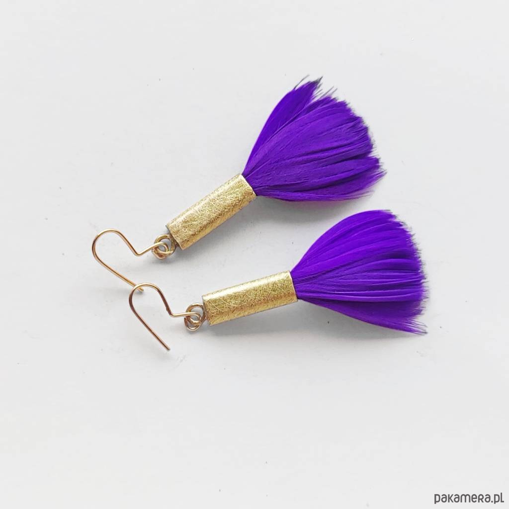 PIÓRKO - stylowy dodatek. Połączenie lekkości piórka i trwałości metalu. Metal niezwykle kontrastuje z naturalnym barwionym puchem. Kolczyki wykonane są z mosiądz, naturalnie barwione pióra. Mosiądz - zmatowiony. Bigle otwarte - srebro pr.925 pozłacane. Długość z biglami - 7,5 cm. Szerokość - 3 cm. Waga - ok. 2,5 g.