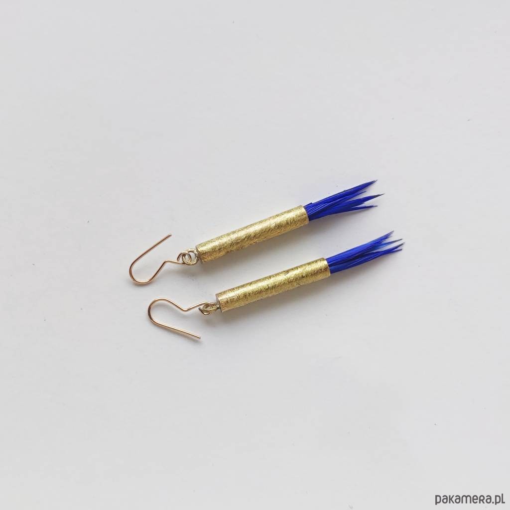 PIÓRKO - stylowy dodatek. Połączenie lekkości piórka i trwałości metalu. Metal niezwykle kontrastuje z naturalnym barwionym puchem. Kolczyki wykonane są z miedzi, naturalnie barwione pióra. Miedź - zmatowiony. Bigle otwarte - srebro pr.925. Długość z biglami - 5,5 cm. Szerokość - 1,5 cm. Waga - ok. 2,5 g.