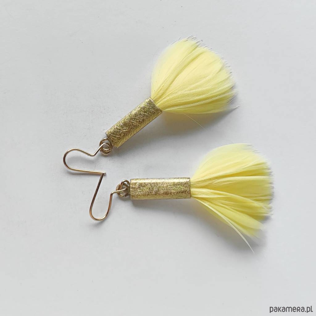 PIÓRKO - stylowy dodatek. Połączenie lekkości piórka i trwałości metalu. Metal niezwykle kontrastuje z naturalnym barwionym puchem. Kolczyki wykonane są z mosiądz, naturalnie barwione pióra. Mosiądz - zmatowiony. Bigle otwarte - srebro pr.925 pozłacane. Długość z biglami - 7,5 cm. Szerokość - 3 cm. Waga - ok. 2,5 g.