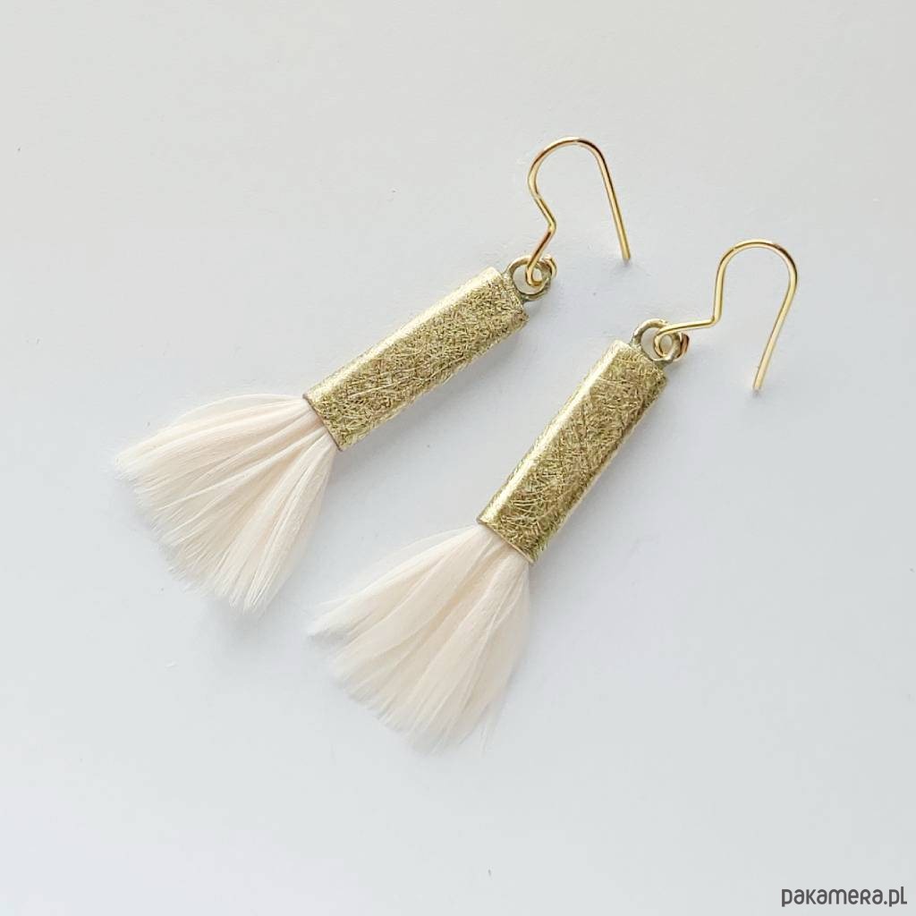 PIÓRKO - stylowy dodatek. Delikatne oraz lekkie kolczyki dodadzą charakteru każdej stylizacji. Metal niezwykle kontrastuje z naturalnym barwionym puchem. Kolczyki wykonane są z miedzi, naturalnie barwione pióra. Miedź - zmatowiony. Bigle otwarte - srebro pr.925. Długość z biglami - 5,5 cm. Szerokość - 1,5 cm. Waga - ok. 2,5 g.