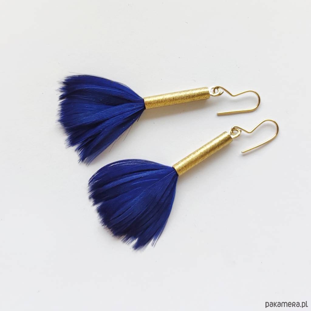 PIÓRKO - stylowy dodatek. Połączenie lekkości piórka i trwałości metalu. Metal niezwykle kontrastuje z naturalnym barwionym puchem. Kolczyki wykonane są z mosiądz, naturalnie barwione pióra. Mosiądz - zmatowiony. Bigle otwarte - srebro pr.925 pozłacane. Długość z biglami - 7,5 cm. Szerokość - 3 cm. Waga - ok. 2,5 g.