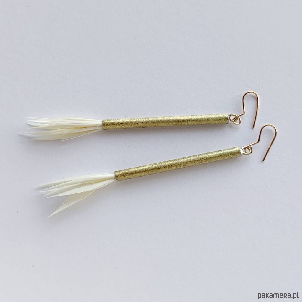 PIÓRKO - stylowy dodatek. Połączenie lekkości piórka i trwałości metalu. Metal niezwykle kontrastuje z naturalnym barwionym puchem. Kolczyki wykonane są z : mosiądz, naturalne barwione pióra. Mosiądz : zmatowiony. Bigle otwarte - srebro pr.925. Długość z biglami - 9 cm. Kolczyki bardzo oryginalne.