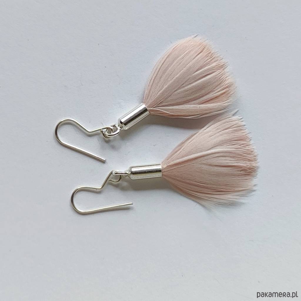 PIÓRKO kolczyki - stylowy dodatek. Połączenie lekkości piórka i trwałości metalu. Metal niezwykle kontrastuje z naturalnym barwionym puchem. Kolczyki wykonane są ręcznie z srebro, naturalnie barwione pióra. Srebro - wypolerowane. Bigle otwarte - srebro pr.925. Długość z biglami - 4,5 cm.
