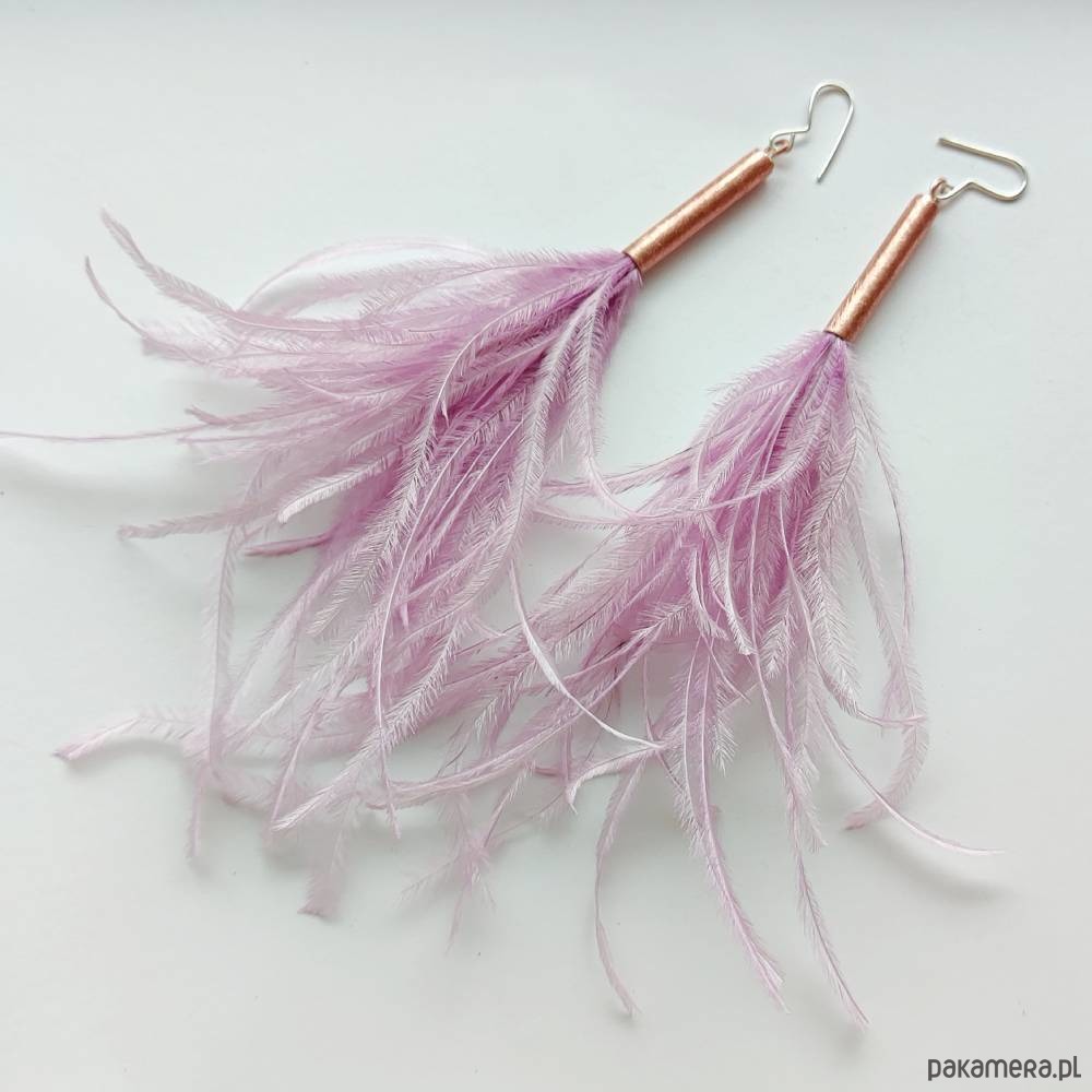 PIÓRKO - stylowy dodatek. Połączenie lekkości piórka i trwałości metalu. Metal niezwykle kontrastuje z naturalnym barwionym puchem. Kolczyki wykonane są z miedzi, naturalnie barwione pióra. Miedź - zmatowiony. Bigle otwarte - srebro pr.925. Długość z biglami - 15 cm Kolczyki są delikatne .