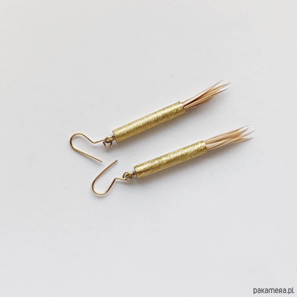 PIÓRKO - stylowy dodatek. Połączenie lekkości piórka i trwałości metalu. Metal niezwykle kontrastuje z naturalnym barwionym puchem. Kolczyki wykonane są z miedzi, naturalnie barwione pióra. Miedź - zmatowiony. Bigle otwarte - srebro pr.925. Długość z biglami - 5,5 cm. Szerokość - 1,5 cm. Waga - ok. 2,5 g.