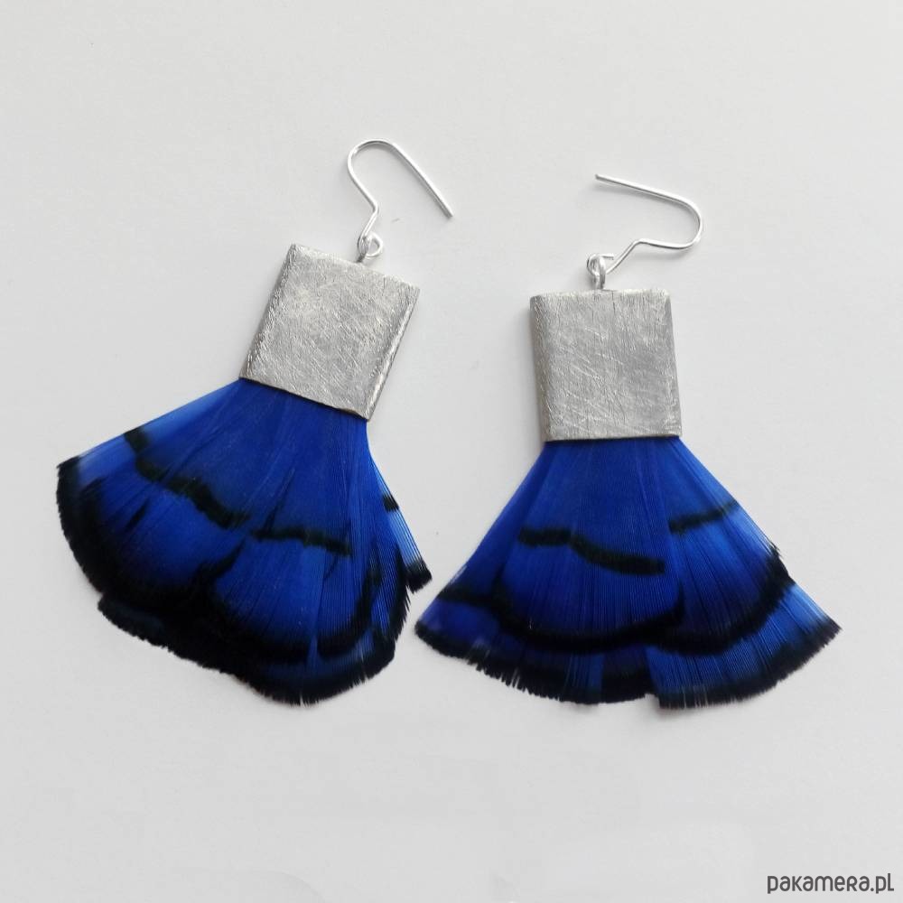 PIÓRKO - stylowy dodatek. Połączenie lekkości piórka i trwałości metalu. Metal niezwykle kontrastuje z naturalnym barwionym puchem. Kolczyki wykonane są z alpaka, naturalnie barwione pióra. Alpaka - zmatowiona. Bigle otwarte - srebro pr.925, . Długość z biglami -7,5 cm. Szerokość - 3,5 cm.