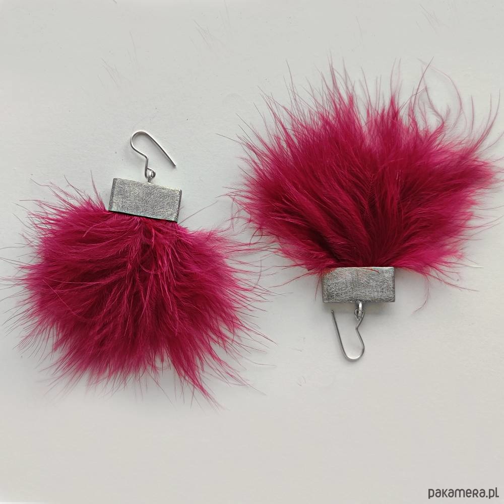 PIÓRKO - stylowy dodatek. Połączenie lekkości piórka i trwałości metalu. Metal niezwykle kontrastuje z naturalnym barwionym puchem. Kolczyki wykonane są z alpaka, naturalnie barwione pióra.Alpaka - zmatowiona. Bigle otwarte - srebro pr.925. Długość z biglami - 8 cm. Szerokość - 8 cm.